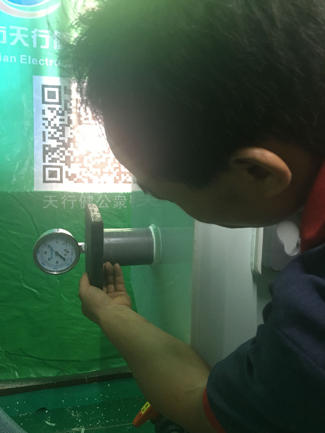 工程师用负压表对破泡机进行压力检测