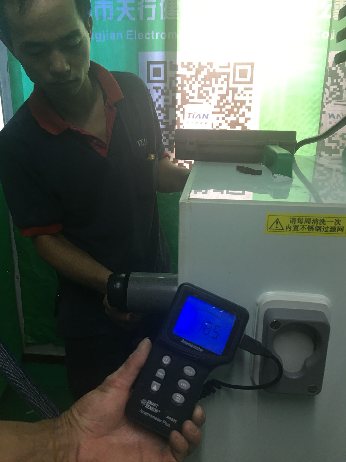 工程师用风速表对破泡机风速检测