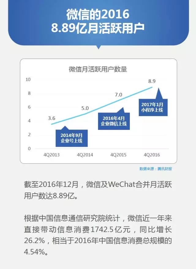 6566ccm爱彩网截止2016年12月统计,微信已经有8.89亿月活跃用户,近一年来直接带动信息消费1742.5亿元——经过六年的高速发展,微信已经成为了中国移动互联网的国民级应用。